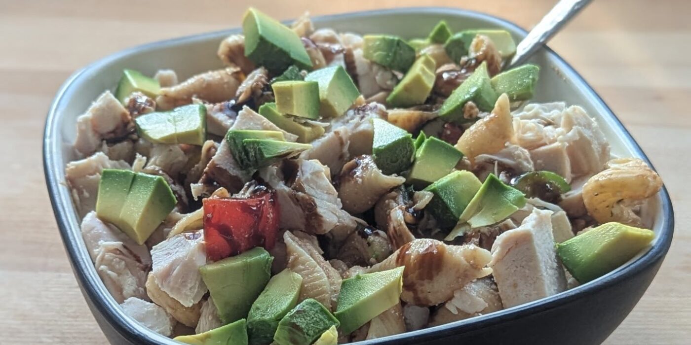 Balanced pasta salad Some pasta, cucumber, tomato, bell pepper, basil, chicken and avocado tossed with olive oil, balsamic vinegar and some flaked smoked salt. This pasta salad gets better with every day it sits in the fridge!