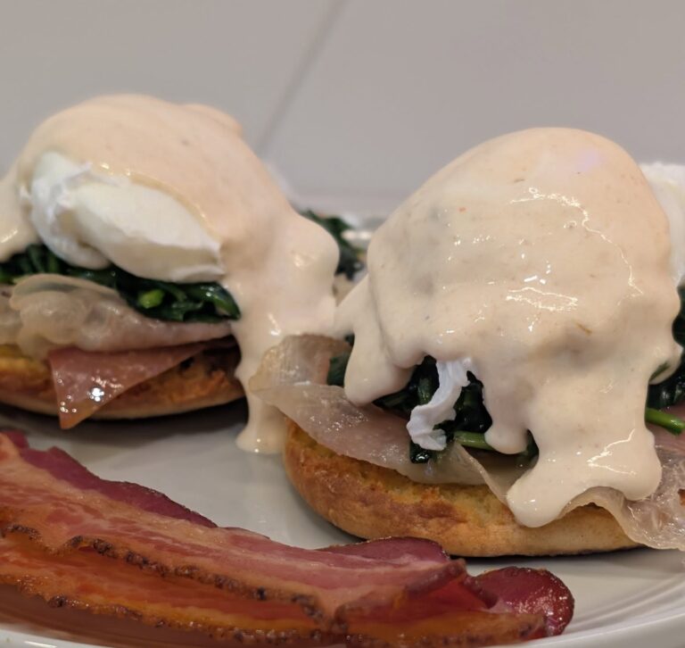 Sunday Benedict English muffin, prosciutto, spinach, poached egg and a sauce that looks like but is not hollandaise. I used some sour cream and hot sauce instead of hollandaise to avoid the high volume of butter. Served up with a side of my home cured bacon. #benedict #brunch #sundaybrunch on March 1, 2026March 12, 2026