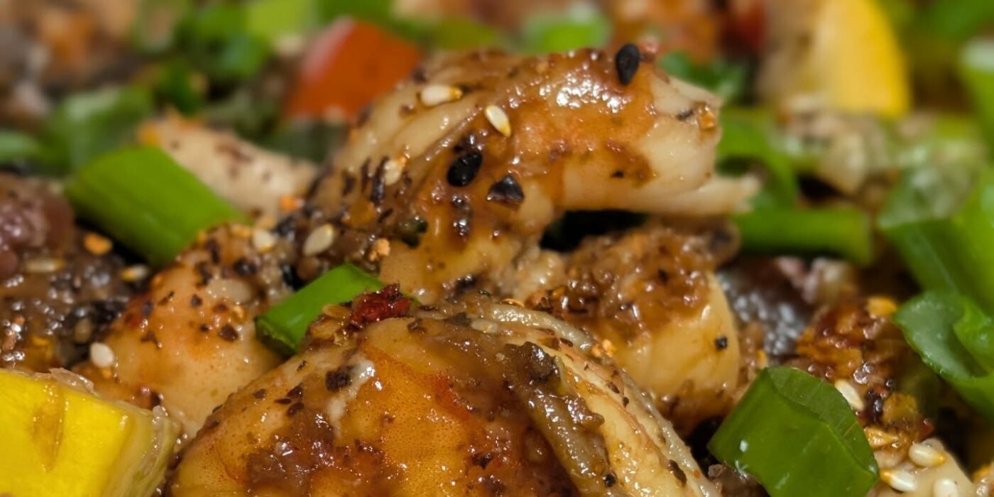 Chicken and shrimp stir fry with noodles. Onions, asparagus, broccoli, squash, carrots and bell pepper stir fried and tossed in a bit of soy sauce, @trybachans and @spiceology togarashi seasoning. Some cubed rotisserie chicken breast was tossed in as well. Cooked separately some shrimp seasoned in togarashi. In another pot some spicy noodles. Everything gets tossed together and topped with chili crisp and green onions. #stirfry