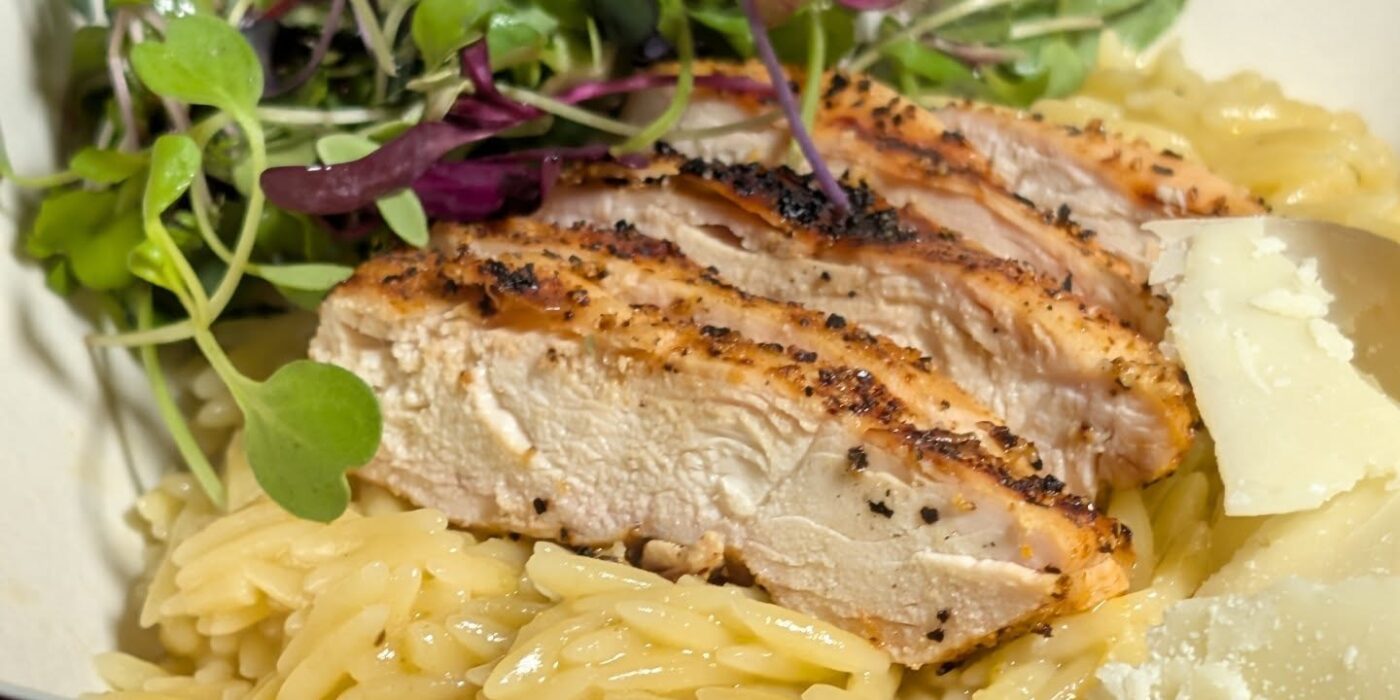 Grilled chicken over lemon orzo with Parmesan and micro greens. I seasoned the chicken with @spiceology buffalo lemon pepper and grilled it over @bearmountainbbq red white and blue blend pellets for that perfect wood fired flavor. This blend burns super efficiently and provides amazing flavor even at higher grilling temps. The orzo cooked with chicken bone broth, lemon juice and lemon zest, seasoned with @spiceology Greek freak. I added Parmesan for a bit of cheese salty punch, and micro greens round of that umami flavor. The first photo is a beautiful shot of the dish, but I needed more protein so scroll to see the bowl with another chicken breast. #bearmountianbbq #chickendinner