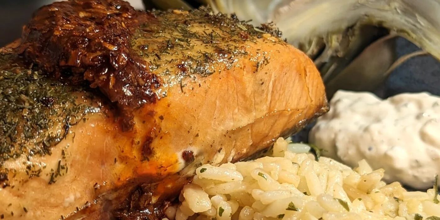 Grilled Salmon over garlic and herb rice with artichokeThis is not a keto dish, this was cooked for my wife, who does not eat keto. The salmon was brushed in a dill mustard and seasoned with @spiceology over easy. It was then grilled at 350 over the open flame of my Yoder Smoker using @bearmountainbbq cherry wood pellets. When the salmon was done it was topped with a touch of chili crisp for a bit of added texture and flavor, layering those flavors!The artichoke was steamed and seasoned with a no salt seasoning from Costco. Served with a side of @laterrafina tzatziki feta dip. The rice was leftover from a dinner she had made the night before and was simply warmed. This is my entry for #thequenion fish dish challenge! #salmon #fishdinner #seafood #gourmetfood #foodphotography #healthyrecipes #finedining #bearmountainbbq