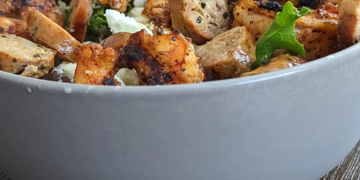 Grilled shrimp and sausage over mixed greensI seasoned some large shrimp with @neilsarap lemon pepper and gave them a quick grill. I also cooked up a few of the @butcher_box Italian chicken sausages. I used @bearmountainbbq wood for the grilling to give a nice light smoke flavor. With the shrimp and sausage prepared, I tossed some mixed greens with ranch dressing and a sprinkle of feta cheese. This salad came together quickly and the shrimp and sausage was fantastic. #salad #bearmountainbbq #shrimp #chickensausage #lunchideas #lunchinspo