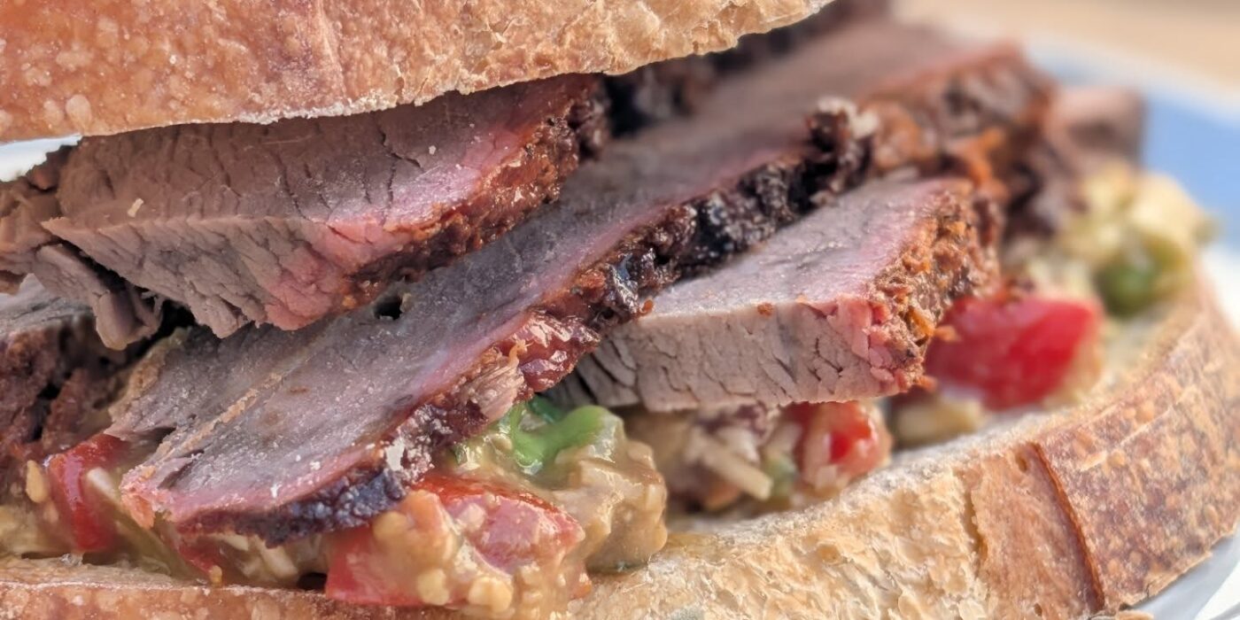 Tri Tip Brisket style sandwich with California Bruschetta I did a low and slow long smoke with @bearmountainbbq gourmet blend on this tri tip. The tri tip was marinated for 2 days in @pepperexchange cayenne mustard and then coated in @spiceology black and blue seasoning. The bruschetta was a mix of fresh tomatoes, garlic, basil, pecorino romano, balsamic and smoked salt. Then to make it California, I added some cubed avocado. Loaded up on some Toasted homemade sourdough bread! The smoke from the gourmet blend did some magic to this tri tip. Giving it a rich but sweet smokey flavor to offset the spice from the mustard. It played really well into the black and blue seasoning. Then by adding a smoked salt to the bruschetta, everything came together so nicely. #bearmountianbbq #bruschetta #steaksandwich